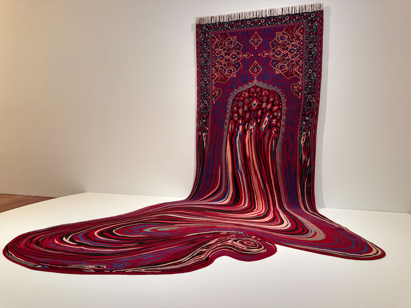 The description of this one says something about exploring where the boundaries of tradition and innovation begin and end… Cotton warp and weft; plain weave with symmetrical knots, wool pile, and cotton fringe. I couldn’t tell if the lower part is coils of yarn (reminding me of the piece in the photo above) or if they are attached in some way.