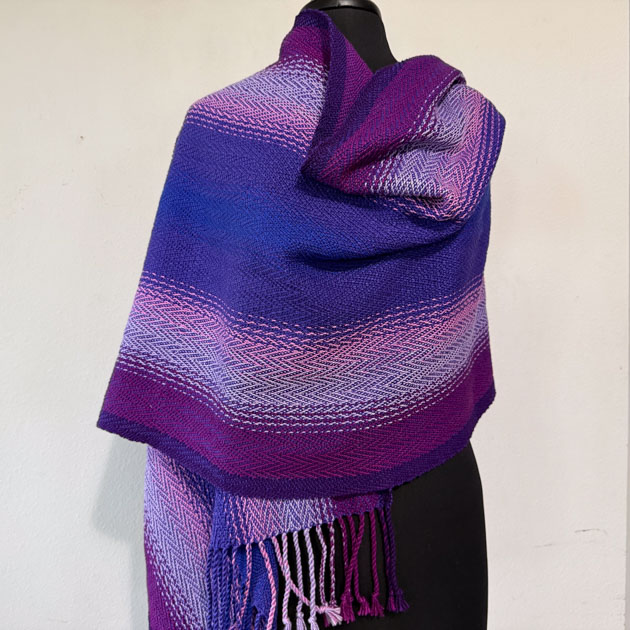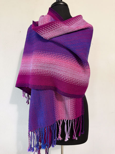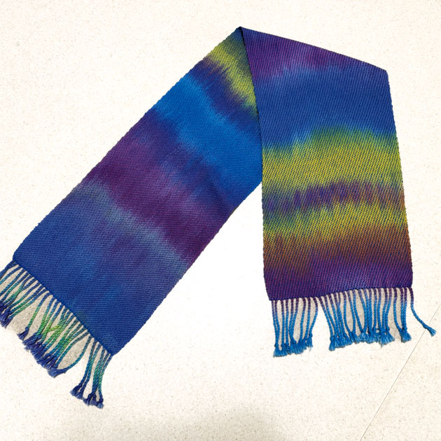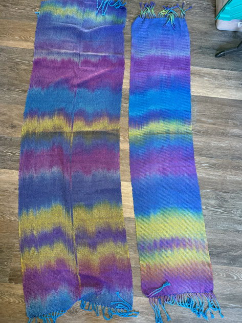 I wove these recently but they are from a warp I dyed several months ago. Can you tell that the warp was folded in half while I applied dye? Each half became a scarf.
