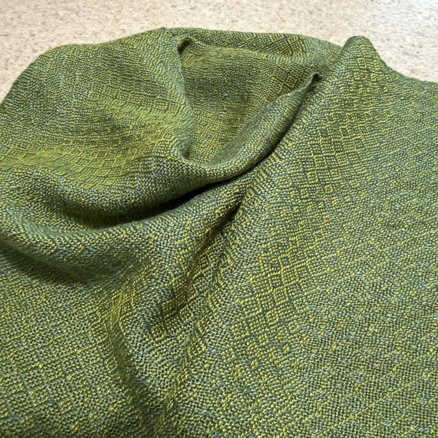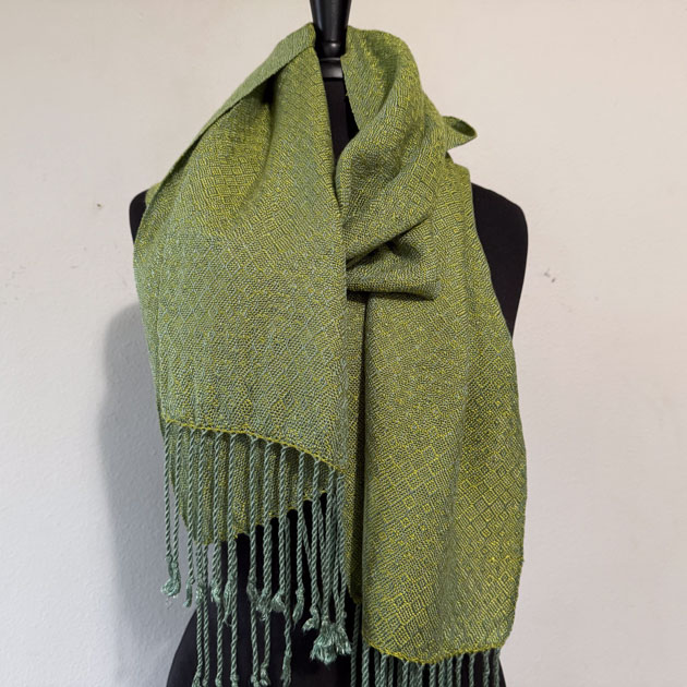 This is a tencel scarf. There is another but I haven’t finished the fringe yet. The photo below gives a somewhat better idea of the iridescence to the pieces.