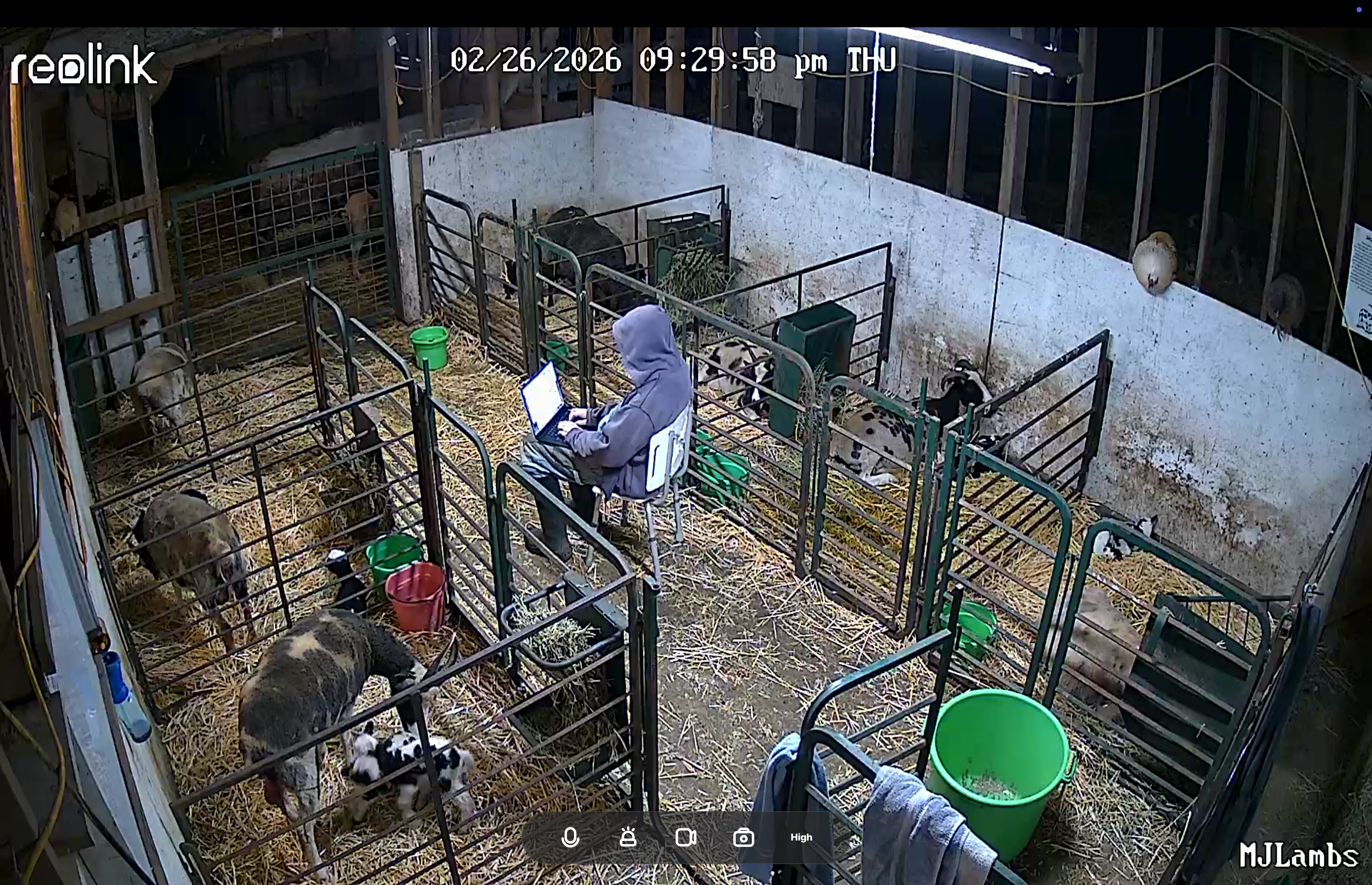 A Farm Club member took a screenshot of her view of my barn camera. I knew I had to spend some time at the computer and figured I’d do it in the barn while waiting for lambs. These are all twins except for Addy at the top corner. It was not a cold day but the bugs were bugging me; therefore, the hood.
