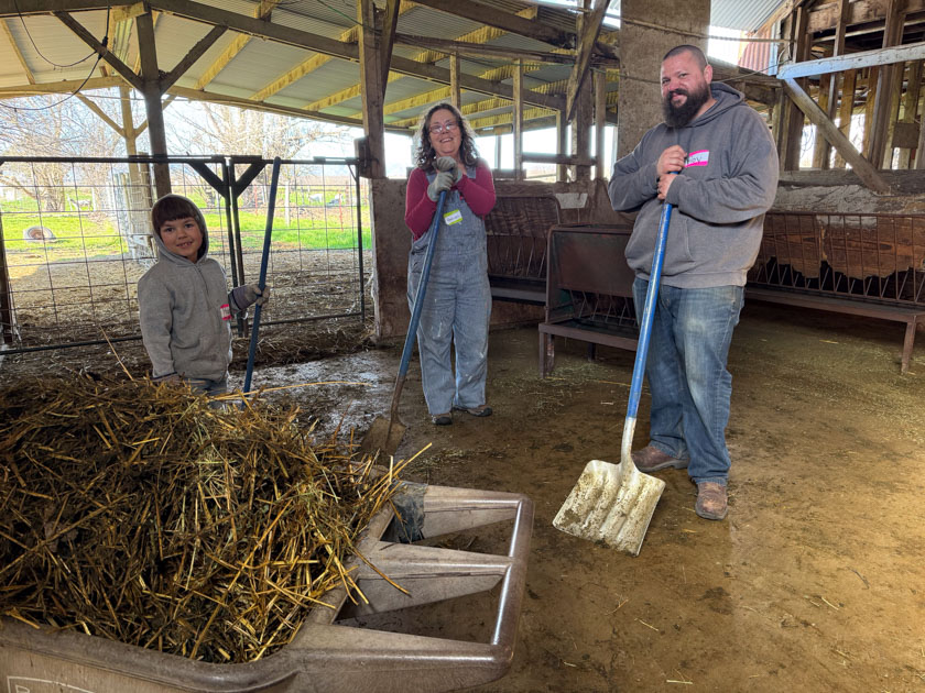 It was daylight as I finished cleaning the barn, but still foggy. Sheep are off the pasture now because it’s so wet, so they were waiting to be fed.