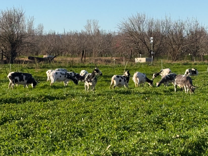 I took the photo below from the website we use to read the soil moisture info. I thought it would be interesting to see the aerial view of the farm. Our 10-acre farm is the green square in the center (plus buildings). There is an almond orchard north of us and alfalfa on the east. When I write about Across the Road that is what I’m talking about. There is a large canal on the south just past the driveway that leads to the neighbors on the west. This photo is from before we did the work in 2024 and still had an open ditch for irrigating. You can tell that we had eight fence lines in the south pasture. There are now nine interior fence lines running north-south, each 60′ apart. There are valves in the new irrigation pipeline every 30′, so when I graze I can either graze the 60′ wide strip or split that into two 30′ wide paddocks.