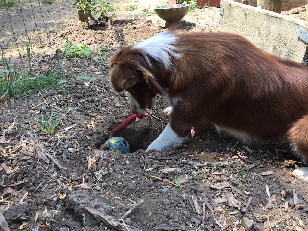 Rusty, Ginny, and Maggie pursuing some kind of critter, probably a ground squirrel that ran into the woodpile.