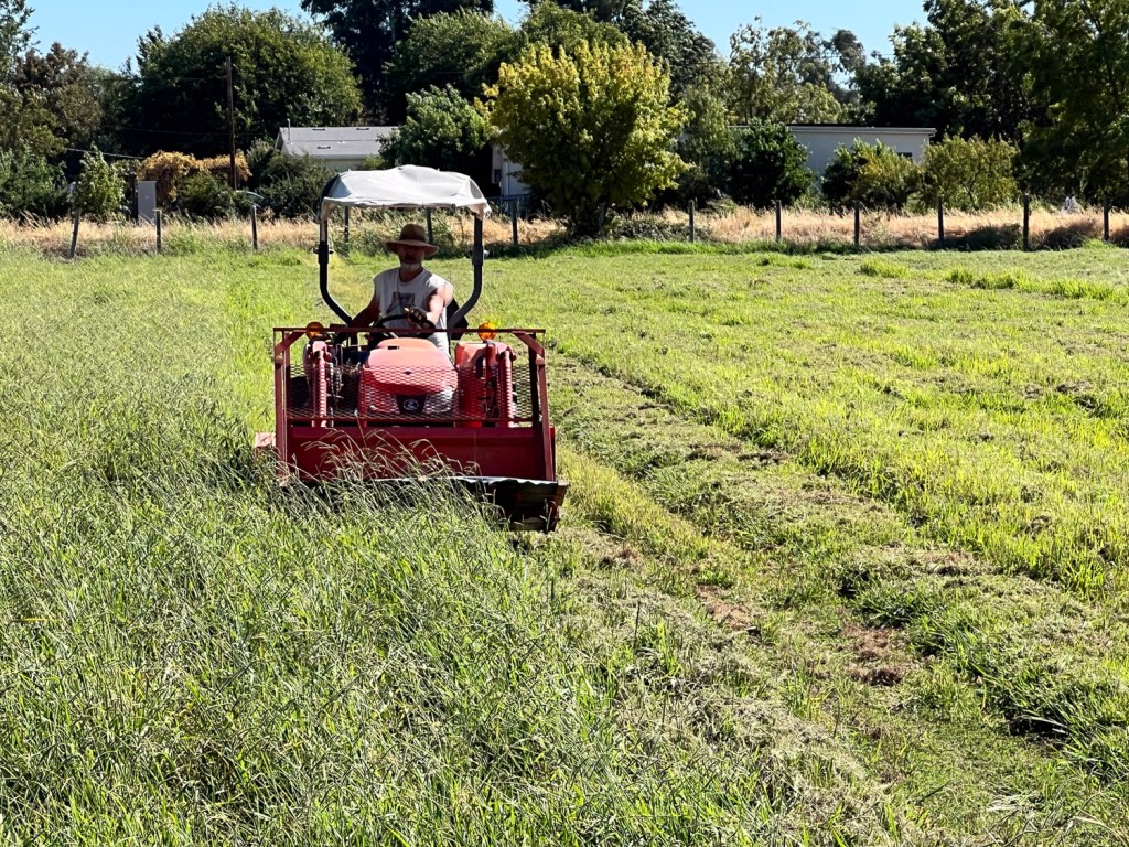 Then he started mowing…and mowing…and mowing. That tall grass is mostly dallisgrass that has taken over a good part of the pasture. It can grow 5′ tall and the sheep can’t keep up with it once it takes off in the summer. The sheep can’t (won’t) eat it as it gets coarser through the growing season. It crowds out everything else and is dormant in the winter. Our tractor isn’t strong enough to mow it at ground level when it gets this tall. Dan has to go over each section at least a couple of times.