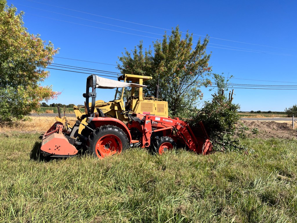 Another task was to make an opening in the fence along the road so the heavy equipment had access. That started with trimming back the tree here. The fence on the south half of field was built by the county when, in 1971 the canal was put in (or enlarged?), and Solano County was deeded the triangular sliver of land along the road. We weren’t going to take down that part of the fence.