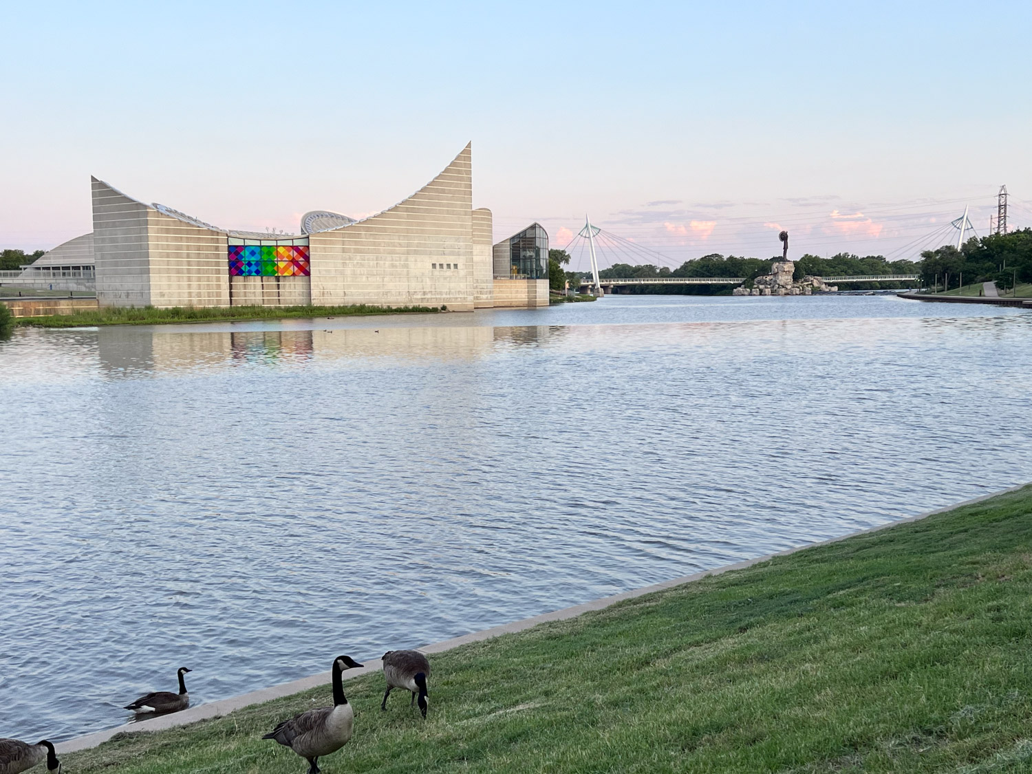This is the Exploration Place. From a quilt on this side to a helicopter inside on the opposite wall it looks as though there is something for everyone here. The bridge that you see is a pedestrian bridge that crosses the Arkansas and Little Arkansas Rivers at the confluence.
