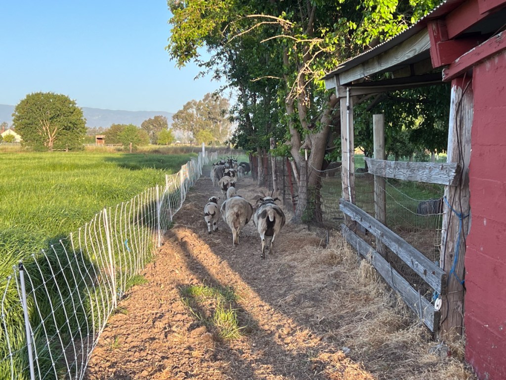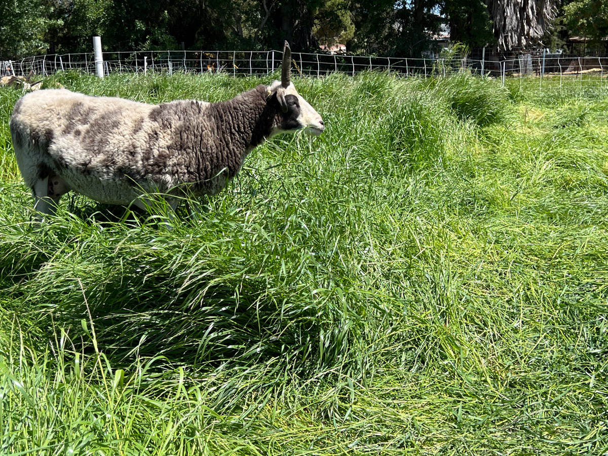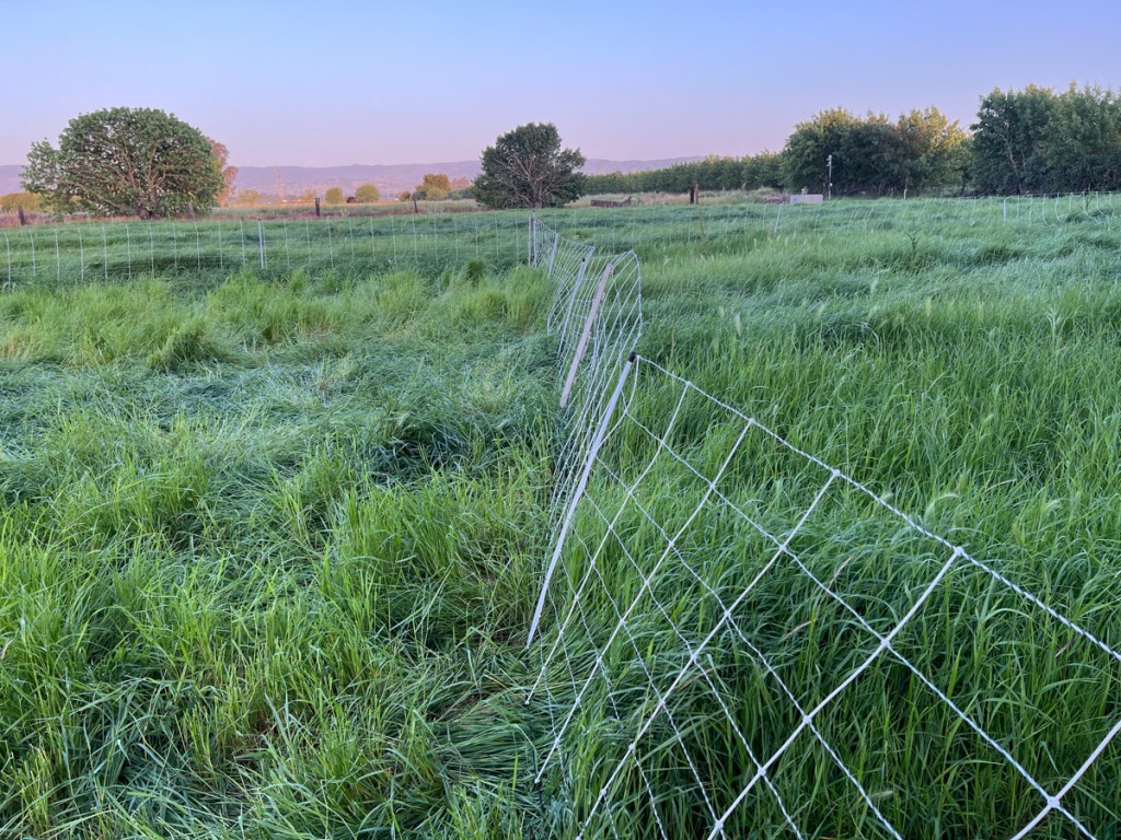 The smaller field on the north is different. We didn’t graze early enough and this is where the annual ryegrass had such a head start on the clover and overwhelmed it in places. I took this photo while irrigating two weeks ago. While the pasture was flooded, some of the ryegrass “mulch” floated and I was able to rake a lot of it into piles thinking that I’d be able to move it out with the tractor.