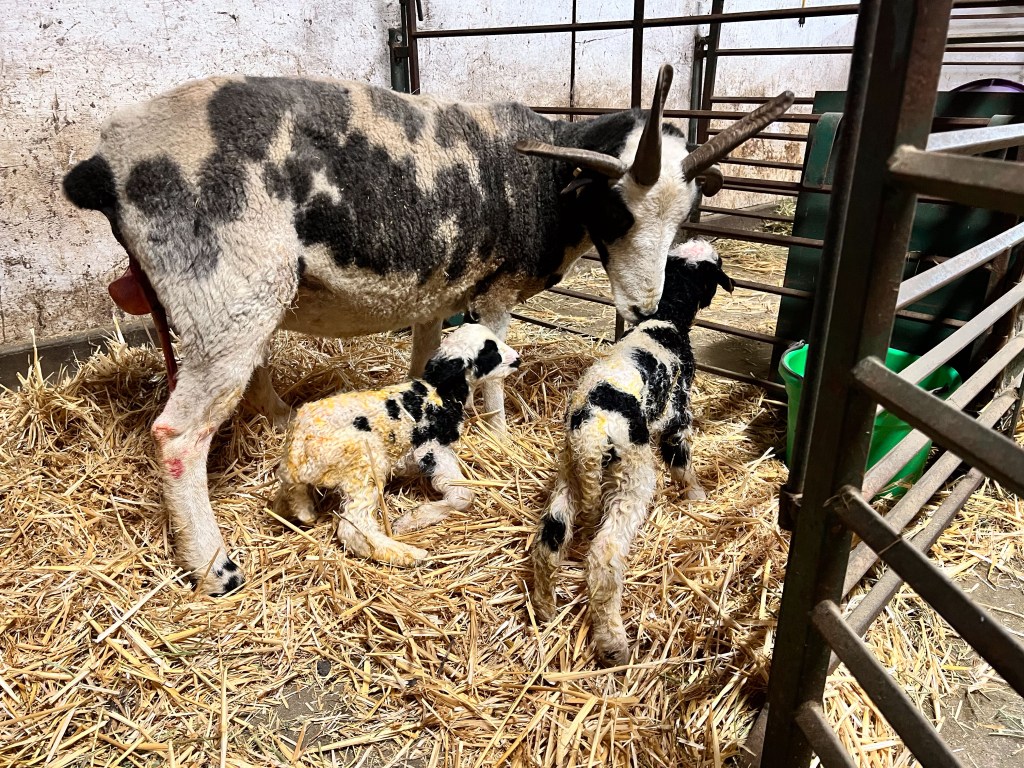 The last lambs of Lambing Season, Part 1, were born two days ago, March 31. Part 1? That’s another story, but there may be four ewes due to lamb at the end of April. This is Tamara with two ewe lambs, #2553 and 2554.