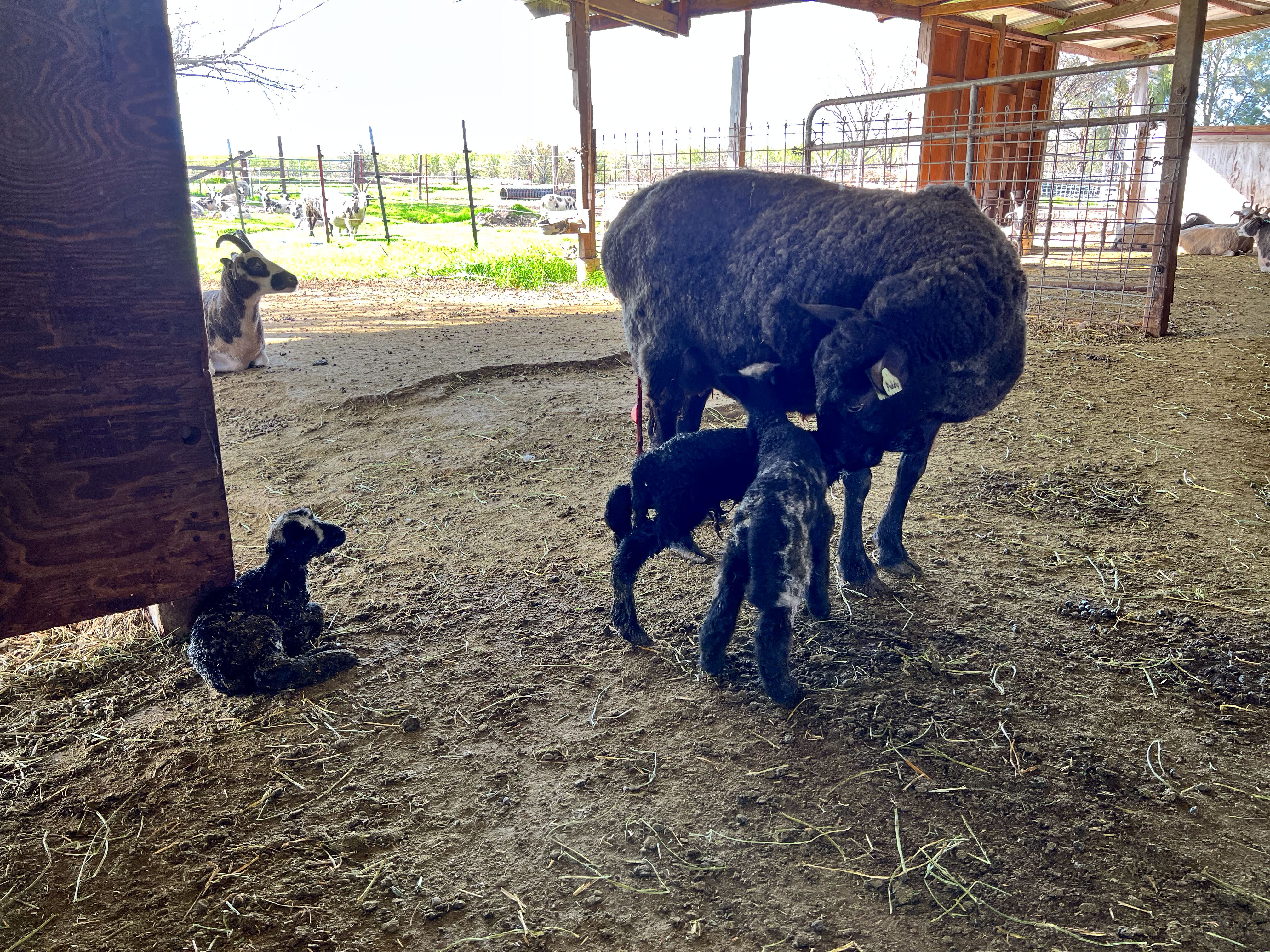 Then Jasmine lay down and had a second lamb, or is it a third? In any case, Jasmine is now nursing three lambs.