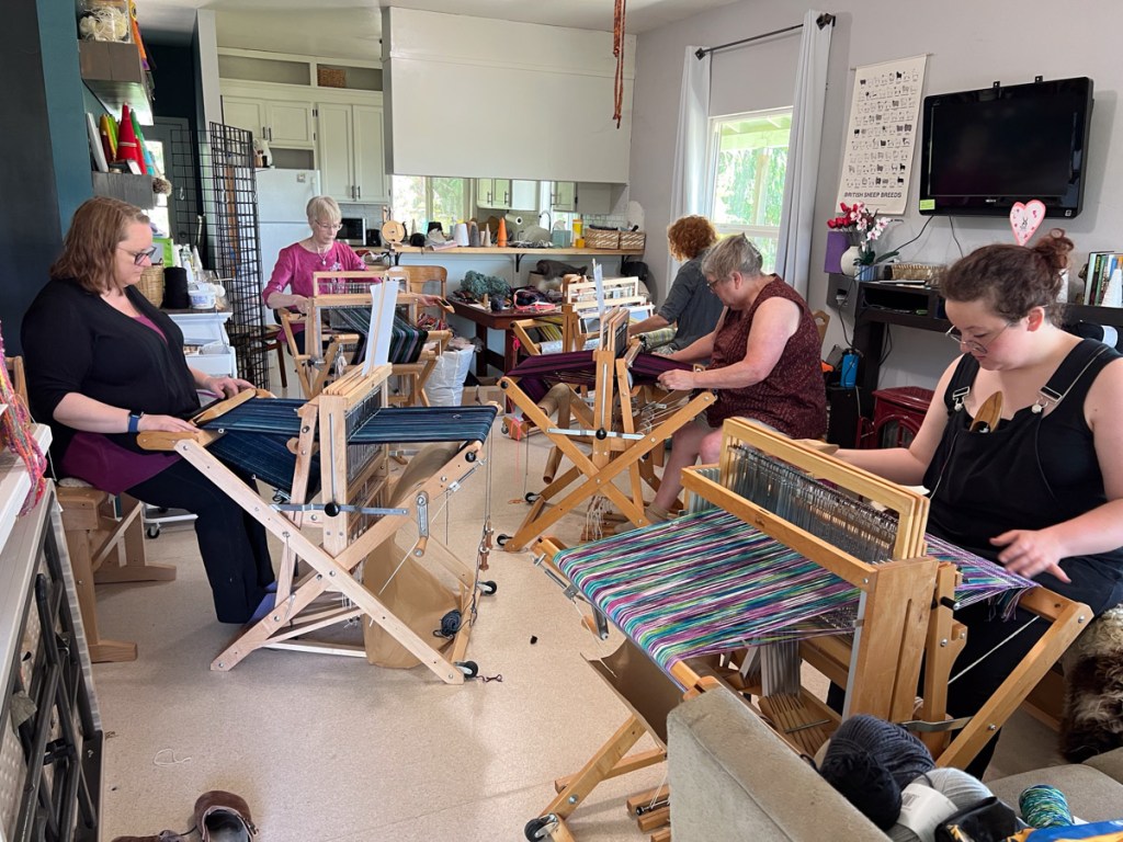 This class had five students. You can see why I can’t take any more than that. #1 all my looms were in use and #2 There is no more room. I didn’t take many photos but will share the few I did get.