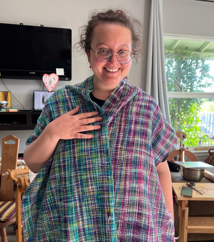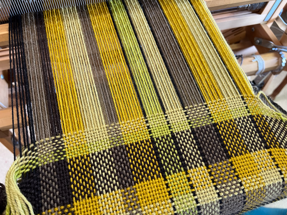 This photo shows one of the shawls partially through the Weave a V part. Warp threads are cut in pairs at the back of the loom and then those warp threads become weft, creating a plaid design.