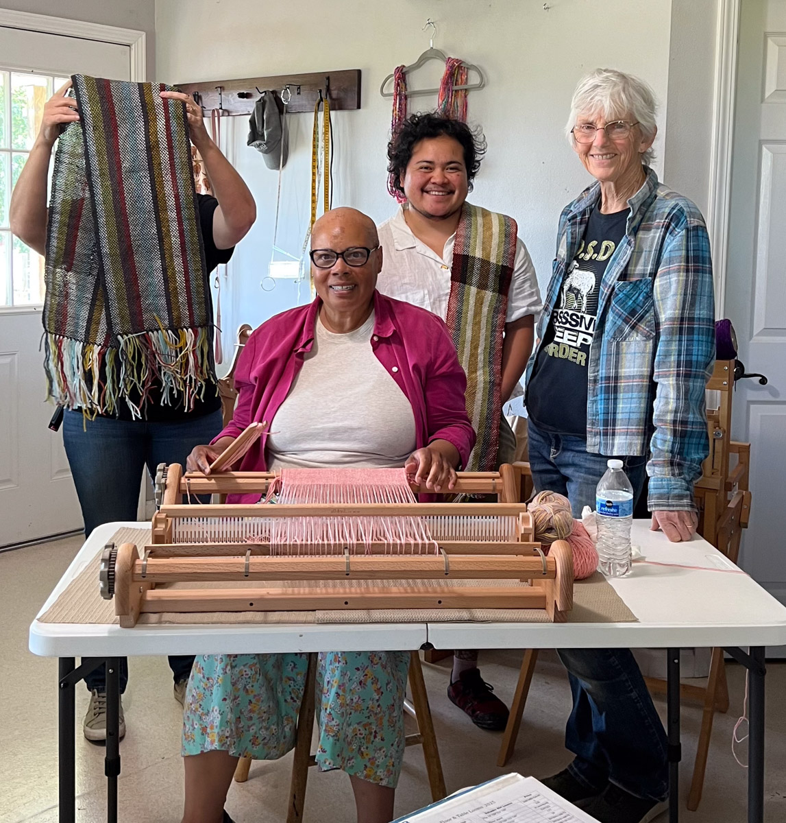 Only a few finished weaving their projects, but that was OK because they all owned the looms. We took a class photo with warps mostly done but not off the looms yet.