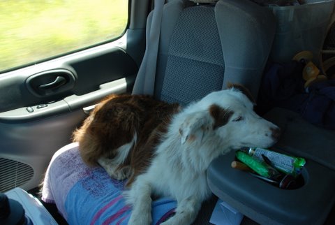 It would seem that Rusty was worn out from the weekend. However, this is how he always travels. In fact if my ice chest weren’t on the floor that is where he’d be. He doesn’t pant, doesn’t look out the window. He just sleeps. Not a bad way to travel if the scenery doesn’t fascinate you.