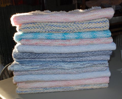 I finally wove some more baby blankets. I have customers waiting. After I took the blankets off the loom I realized that I had a lot of skipped threads along the left side of many blankets. I know why–has to do with combining 7 threads as one in the warp and trying to use 2 threads wound together on the pirn with a fly-shuttle. Just enough drag on the shuttle to cause it to catch the warp threads. AHHHH. That means a lot of fixing. My $/hour just went WAY down. Here are some of the 17 blankets.
