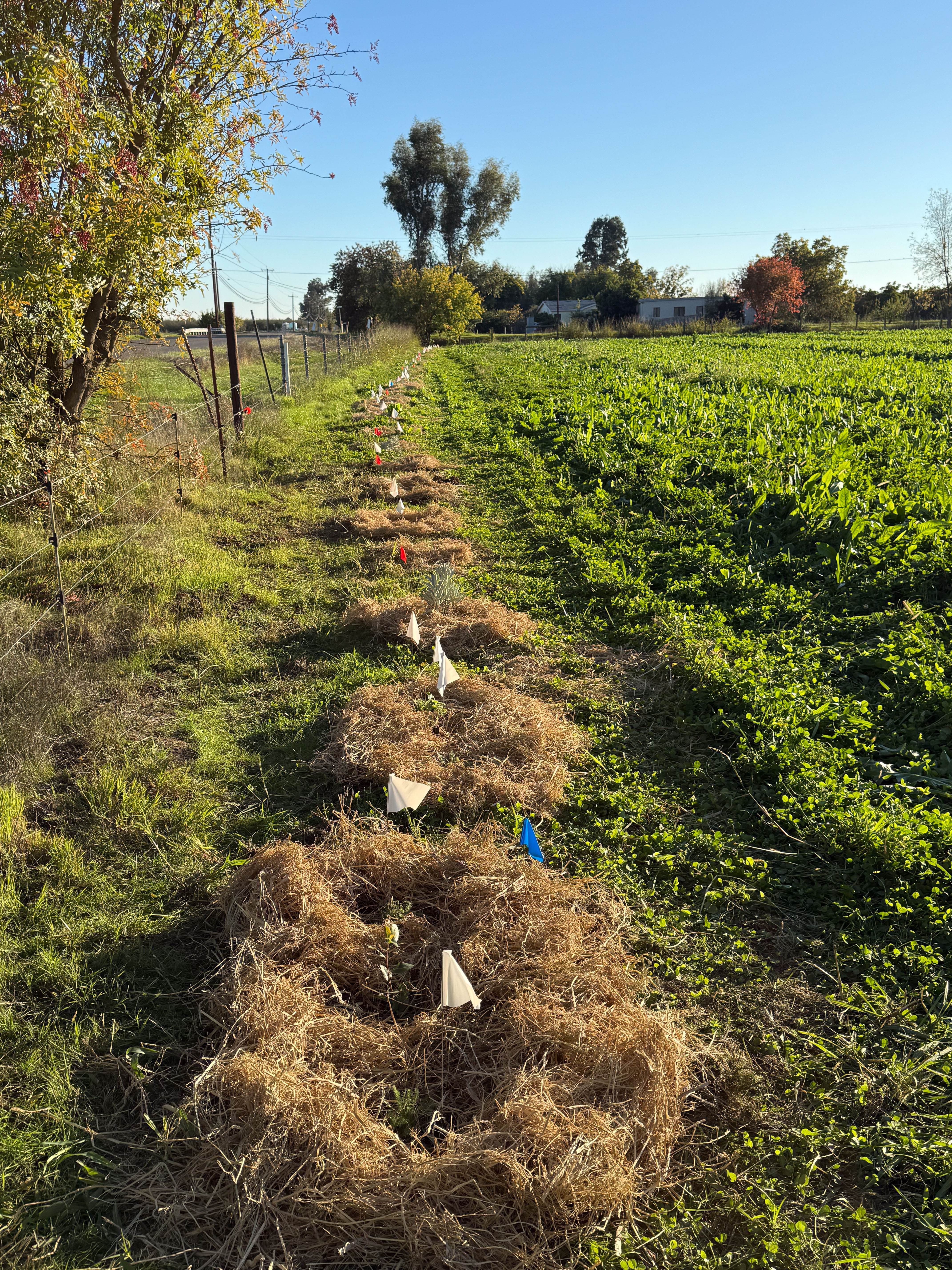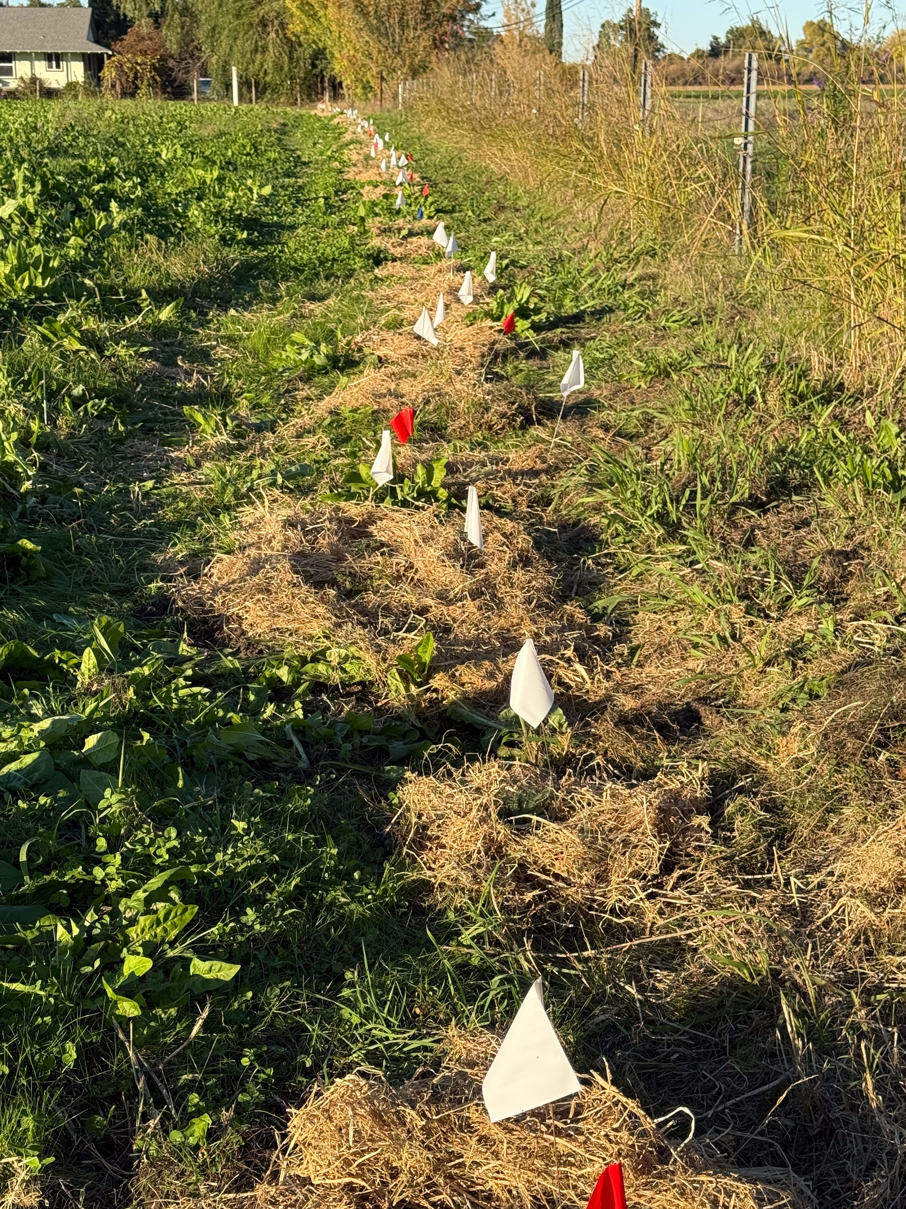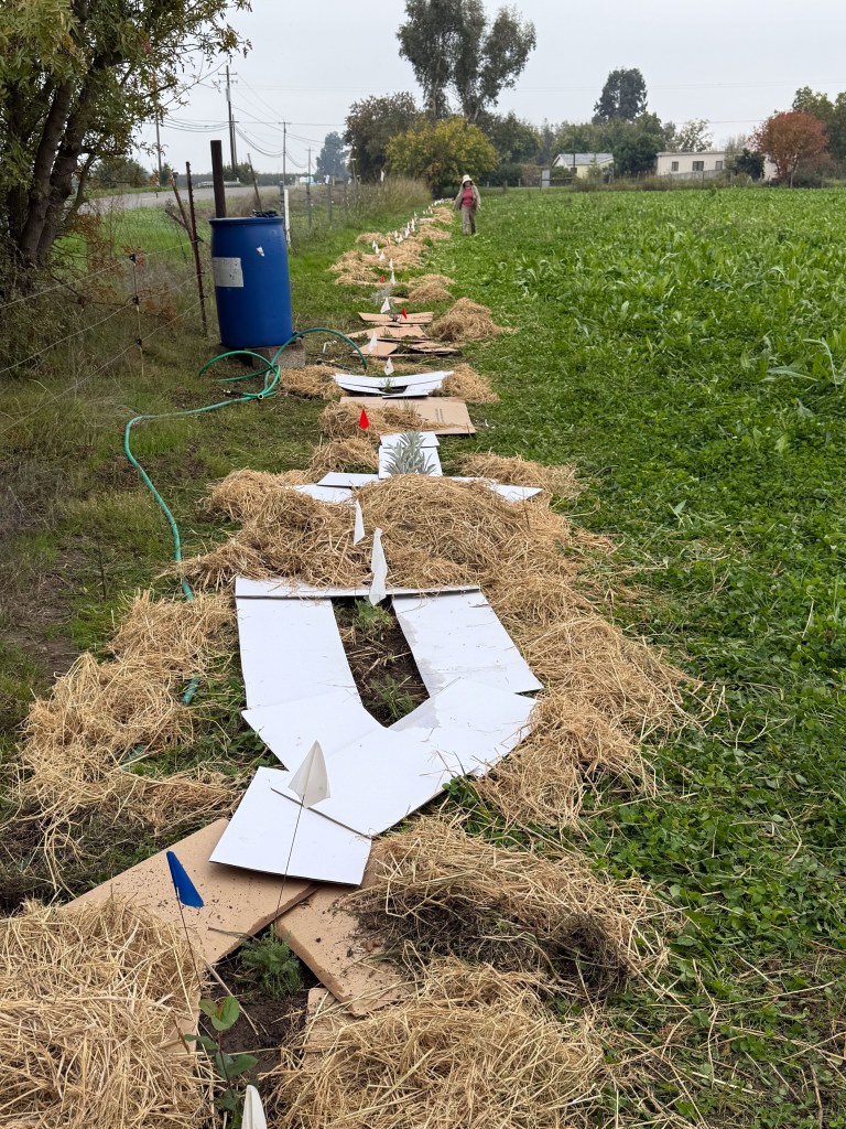 Raquel is a Farm Club member who went out of her way to help figure out how to order what was needed to install a drip system to irrigate our newly planted hedgerow. I had also picked up more cardboard from a friend so we could continue the mulching that we started. We rolled out 250′ of 3/4″ tubing and secured it with u-shaped wires.