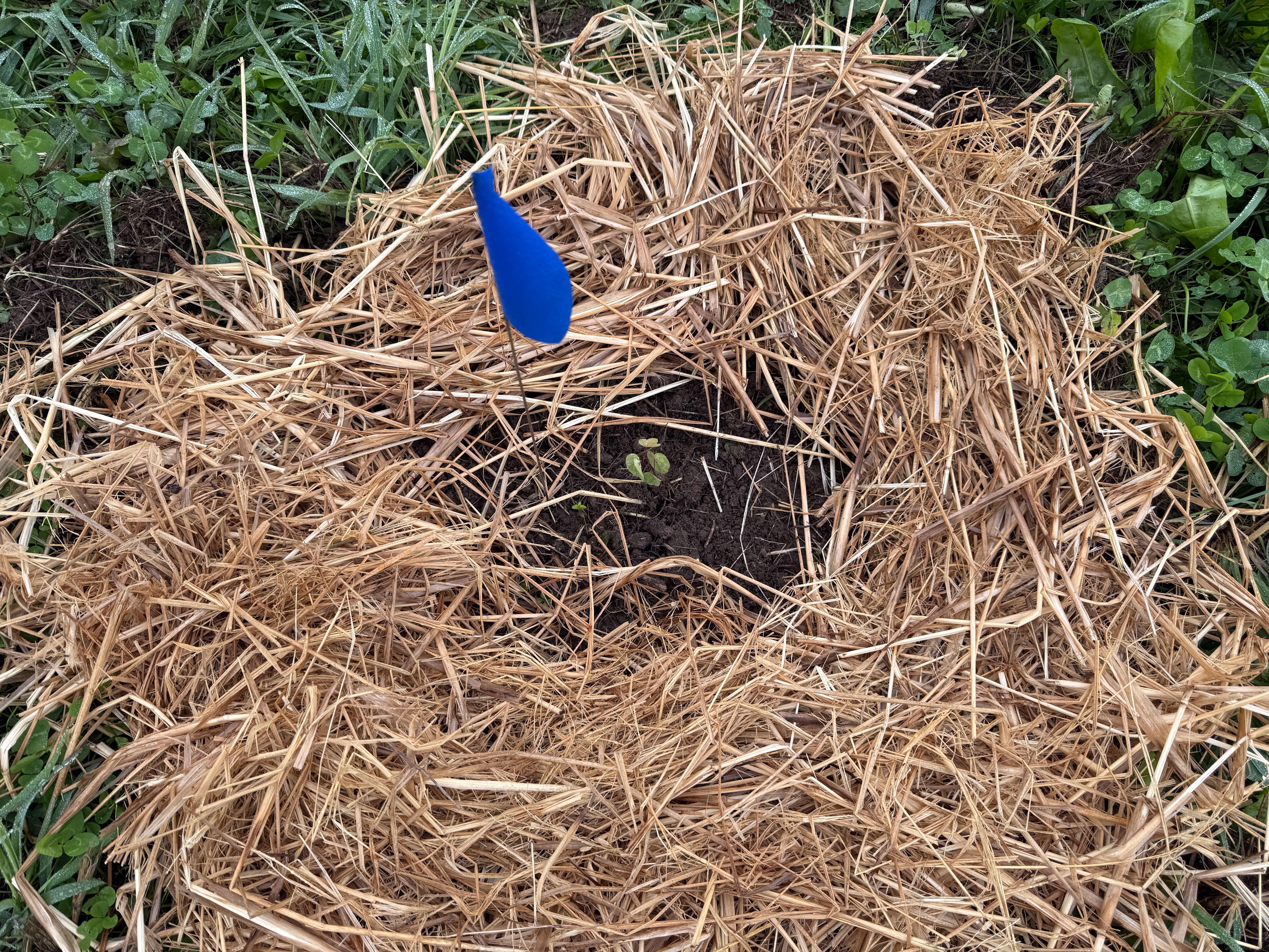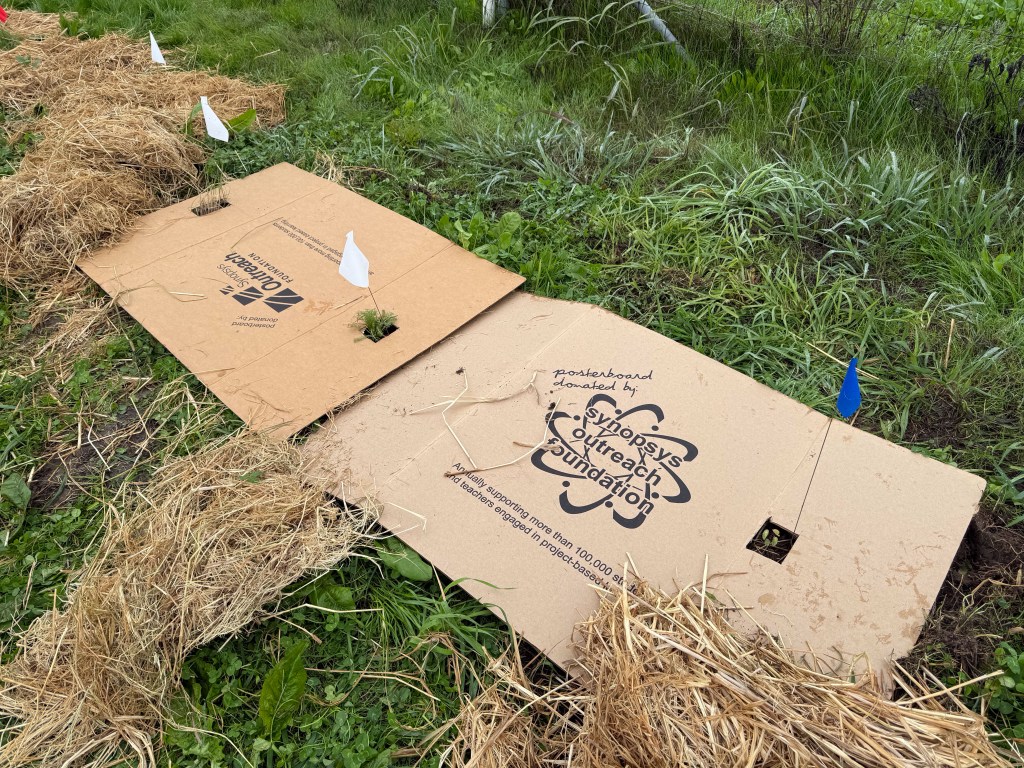 We had cardboard and straw mulch around the plants, but with the new cardboard we were able to cover space between the plants.