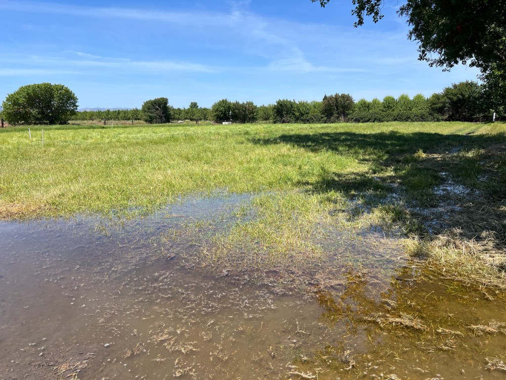 So this photo shows that at 5:30 p.m. there was water all the way down the north pasture and I had opened the first 6 earlier. At this time #1 on this field was finished and I turned #7 and #8 on.