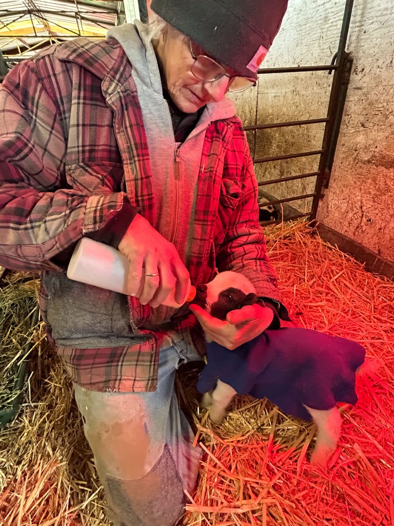 I brought the lamb to the house and put her in a dishpan of warm water. As her body warmed she started to move her legs. After I’d warmed her enough I wrapped her in a towel and went back to the barn. I set up a heat lamp and moved Amara and the big lamb to a clean pen. Lisa was helping for a few days and when she came to the barn I gave her lamb holding duty.
