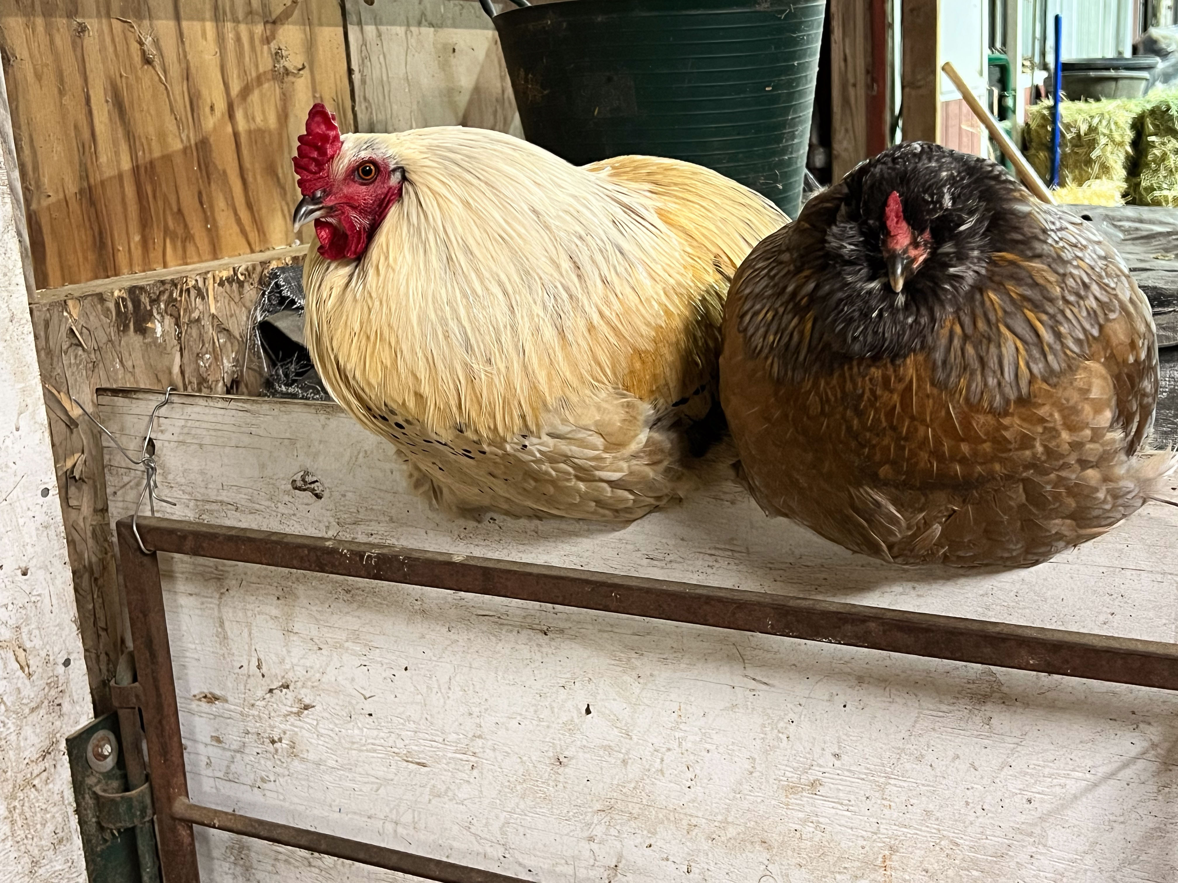 The rooster and one hen roost every night on this panel between the hay and the lambs.