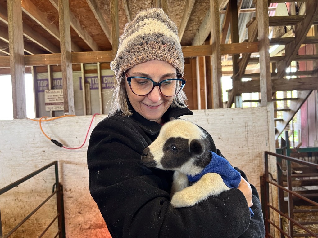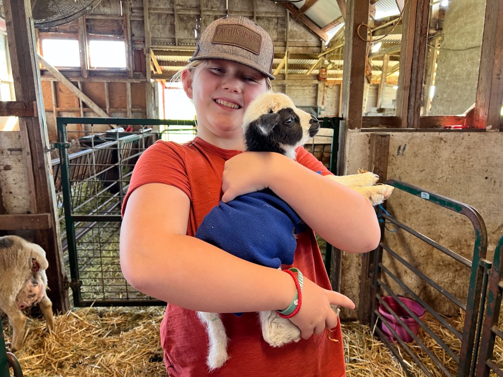 Janna and lambs moved into a stall a couple after lambing. This gives the ewes and lambs more space to move around, but it’s easy to keep an eye on them for a few days before they go out with the other sheep. That’s Farm Club member, Lisa, holding the lamb.