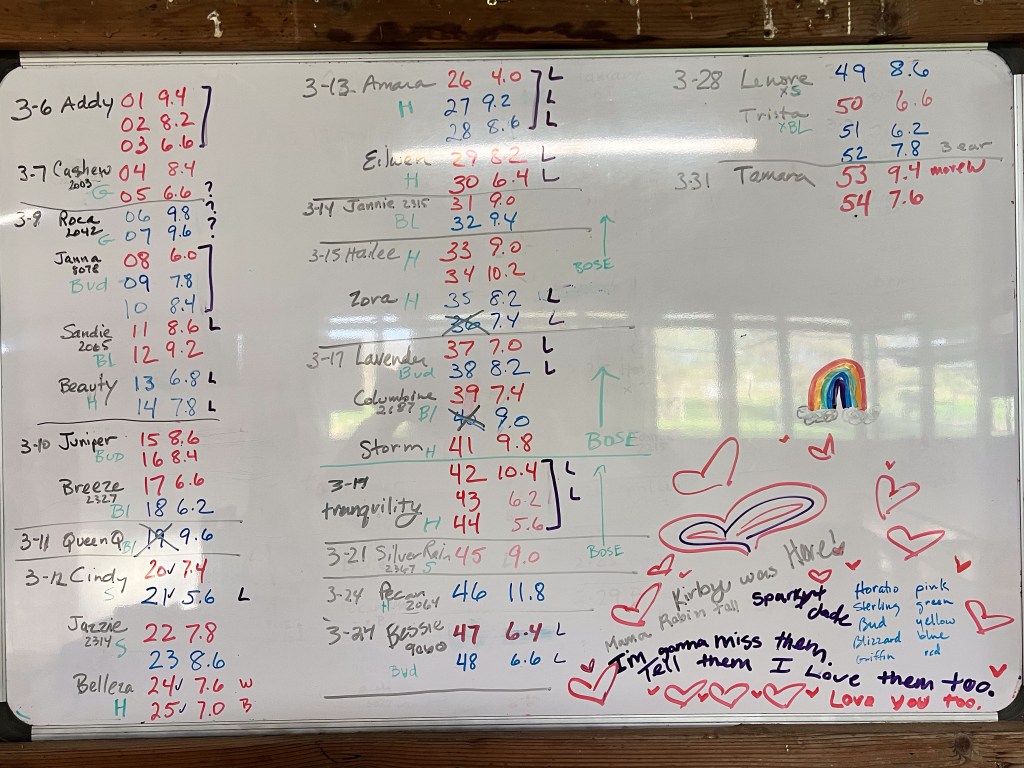 The lambing board shows that there was a lot of action for about a week and then days between the later lambs. My granddaughter made the notes on the board before she left on March 25.