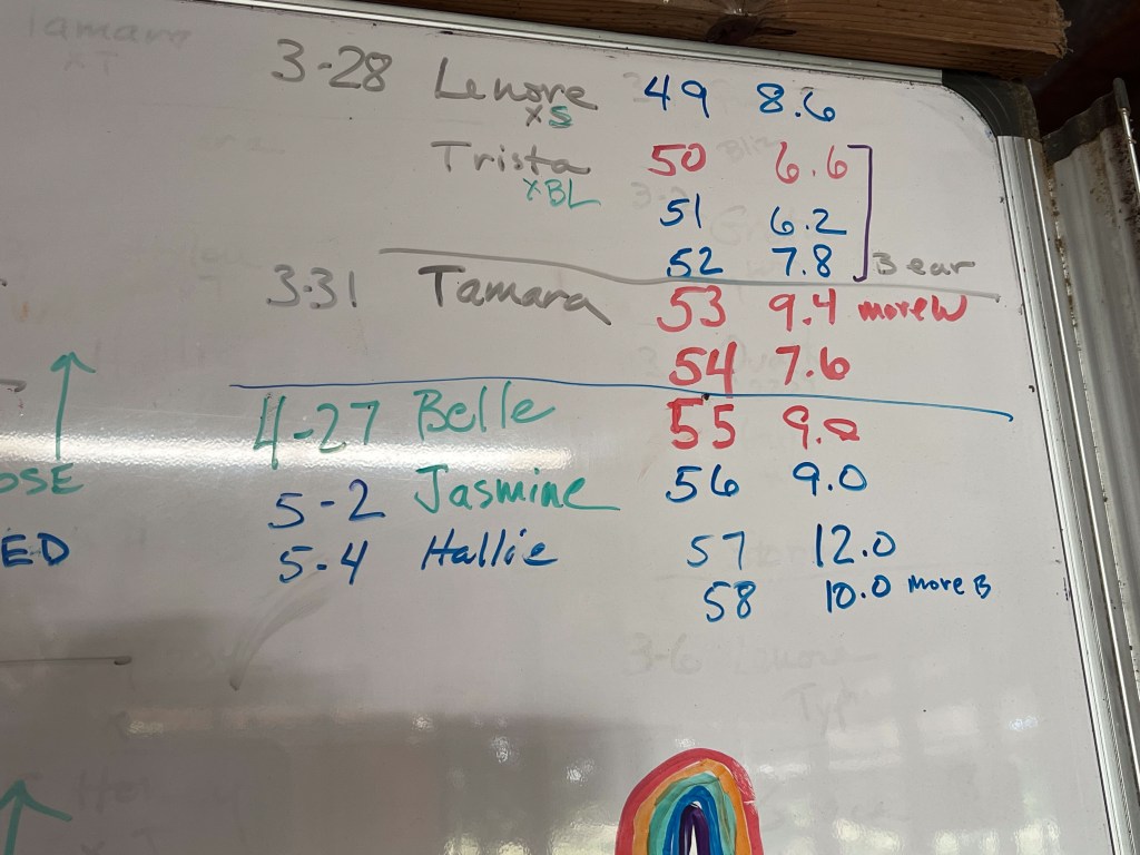 Here are the last entries for the Lambing Board. Hallie’s lambs were 12 and 10 pounds!!