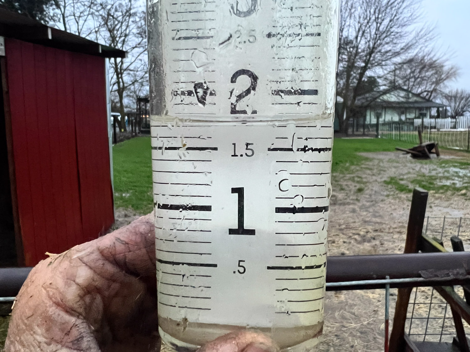 So far it seems that I can graze the sheep on each 30′ strip for two days. I could probably add another day but I want to move them across the field to try and keep up with that ryegrass. We also want to make sure that the clover and trefoil get well established before grazing them heavily. It is time consuming to move that length of fence from one check to another every two days, so this last time I moved only one of the fences to the west. There is no fence down the center of this photo. I moved the fence that was on that check to the next check to the west. So the right half of the photo is where the fresh feed is. The sheep can tell where there is fresh feed, and they spent the next two days mostly on that half. They are also able to eat more of the ryegrass that is still on the check once the fence is removed. If this method works then I’ll move one fence every two or three days.