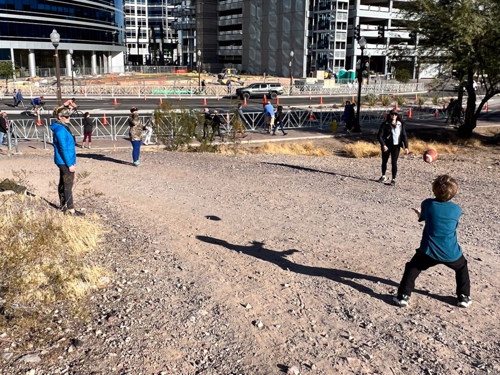 Just down from that hill in the earlier photo and still in sight of the bike course there was a clearing. Kasen had chosen to pack a football for his entertainment. Katie, Meryl, and Kirby were talked into playing catch.