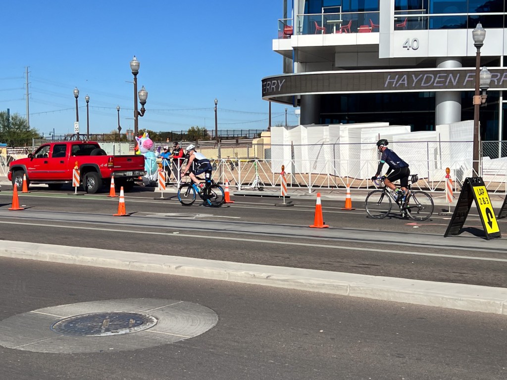 About two hours into the bike portion Chris showed up here for the end of the first loop. The streets had been blocked so there is a lane for bikes and a lane for car traffic going west.
